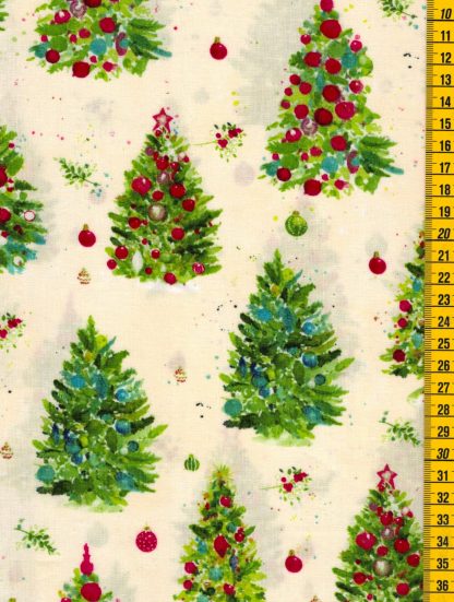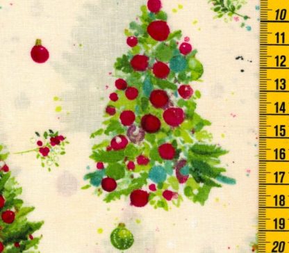 Tissu de patchwork 100% coton de la marque Clothworks collection « Christmas tree ». Tissu de Noël fond écru imprimé de sapins de Noël vert avec des boules rouges et bleues.