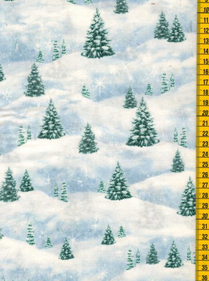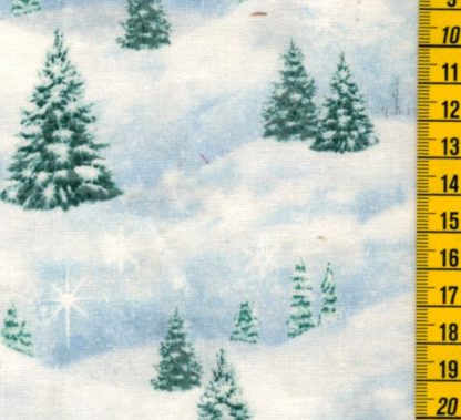 Tissu de patchwork 100% coton de la marque Quilting treasures. Tissu imprimé paysage enneigé fond blanc bleuté avec sapins.