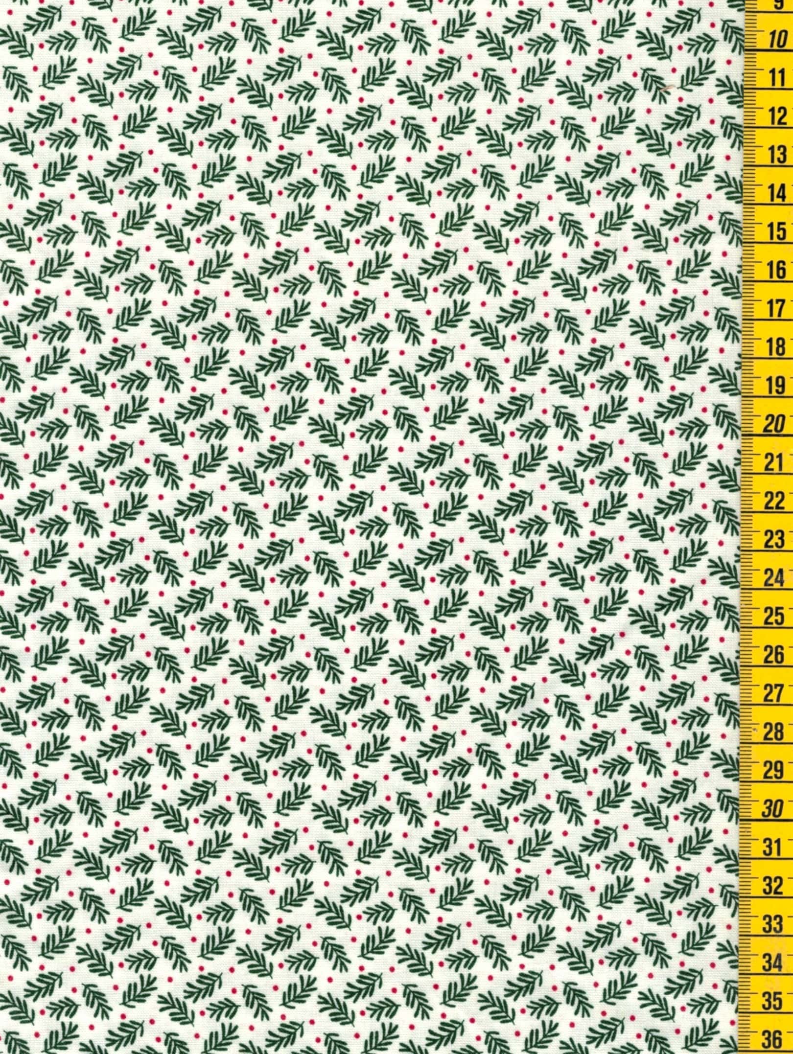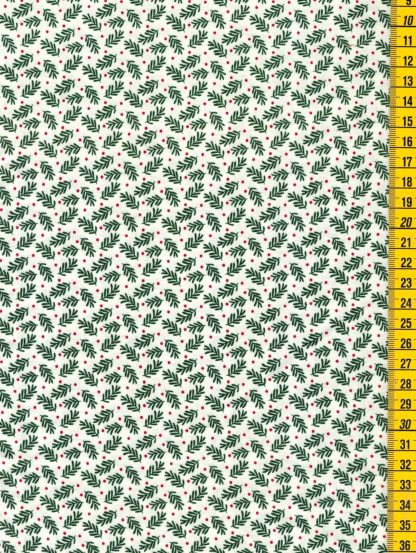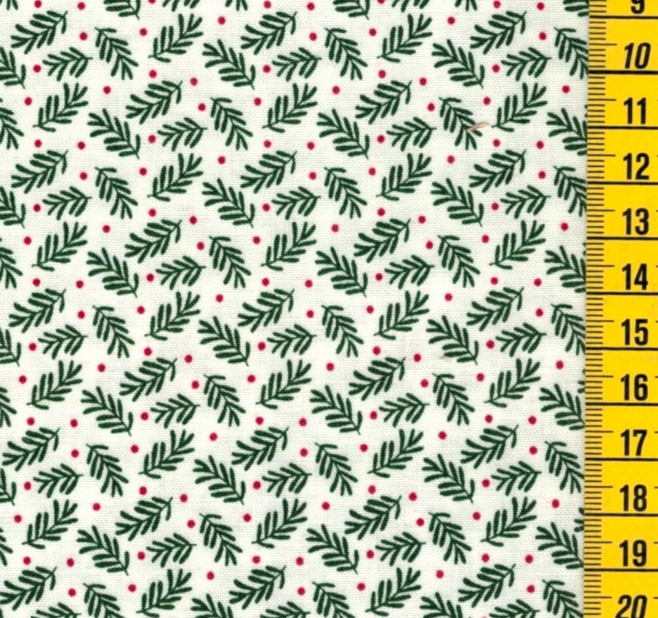 Tissu de patchwork 100% coton de la marque Riley Blake. Tissu fond blanc imprimé de branches de sapin vert foncé et petits pois rouges.